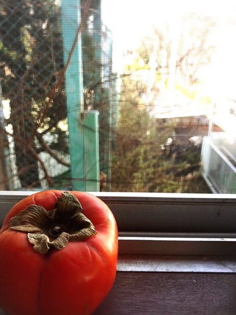頂いた柿と、うちの台所から見える、景色というほどでもない景色。